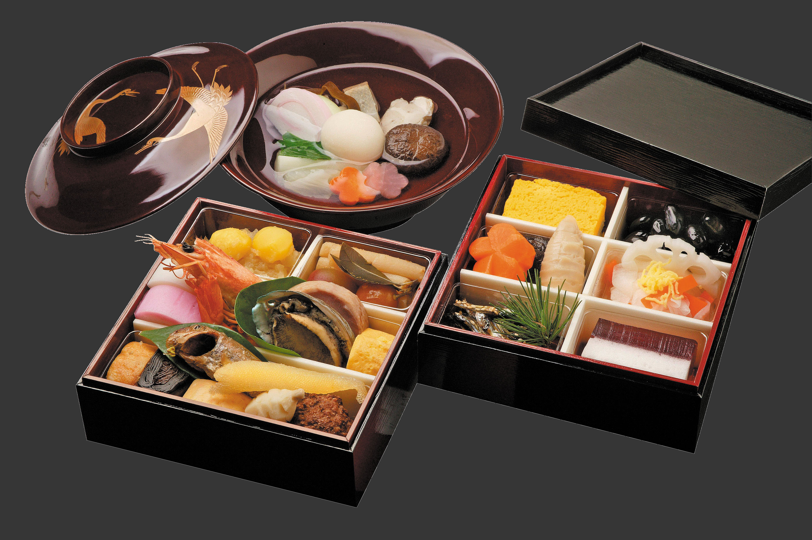 栗きんとん・叩き牛蒡・薄紅梅甘露・金柑甘露・鮑柔煮・有頭海老艶煮・鮭カステラ真薯・紅白蒲鉾・子宝数の子・